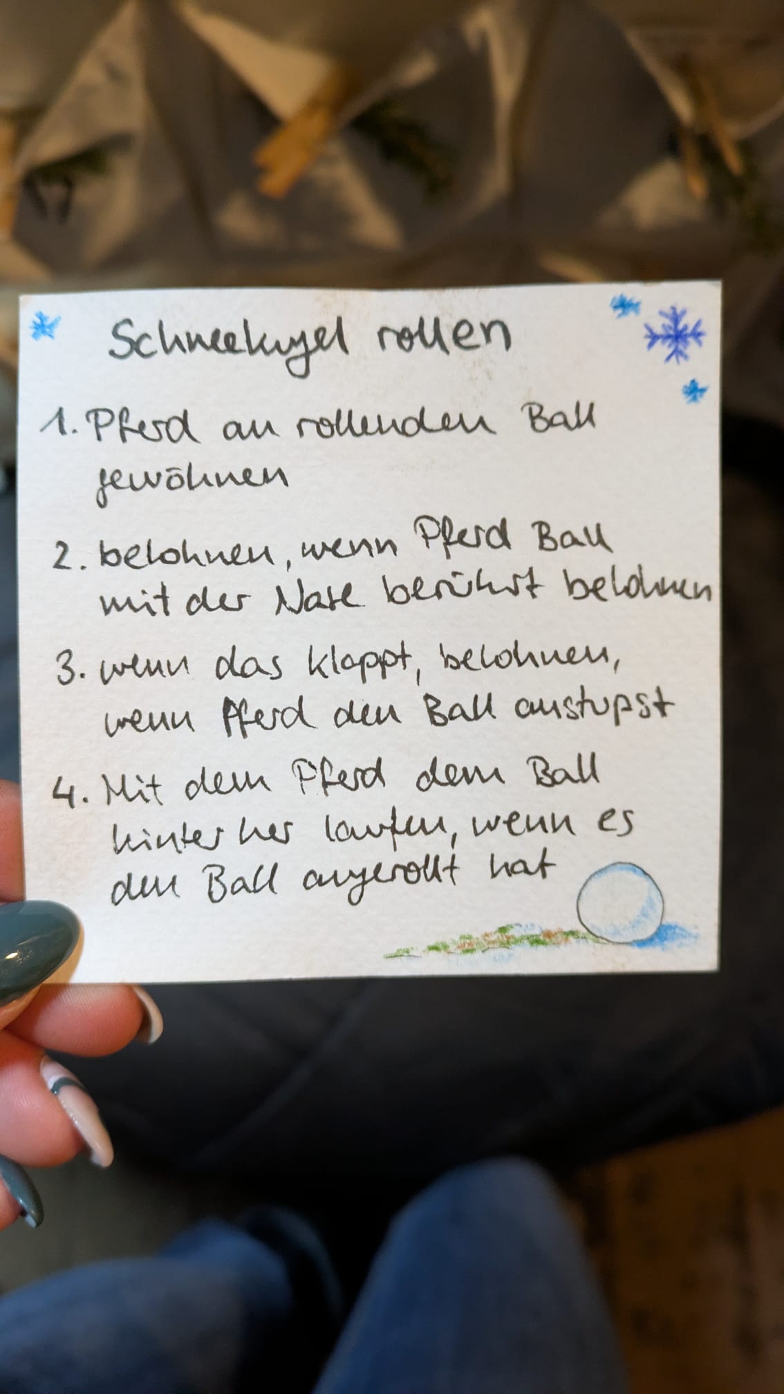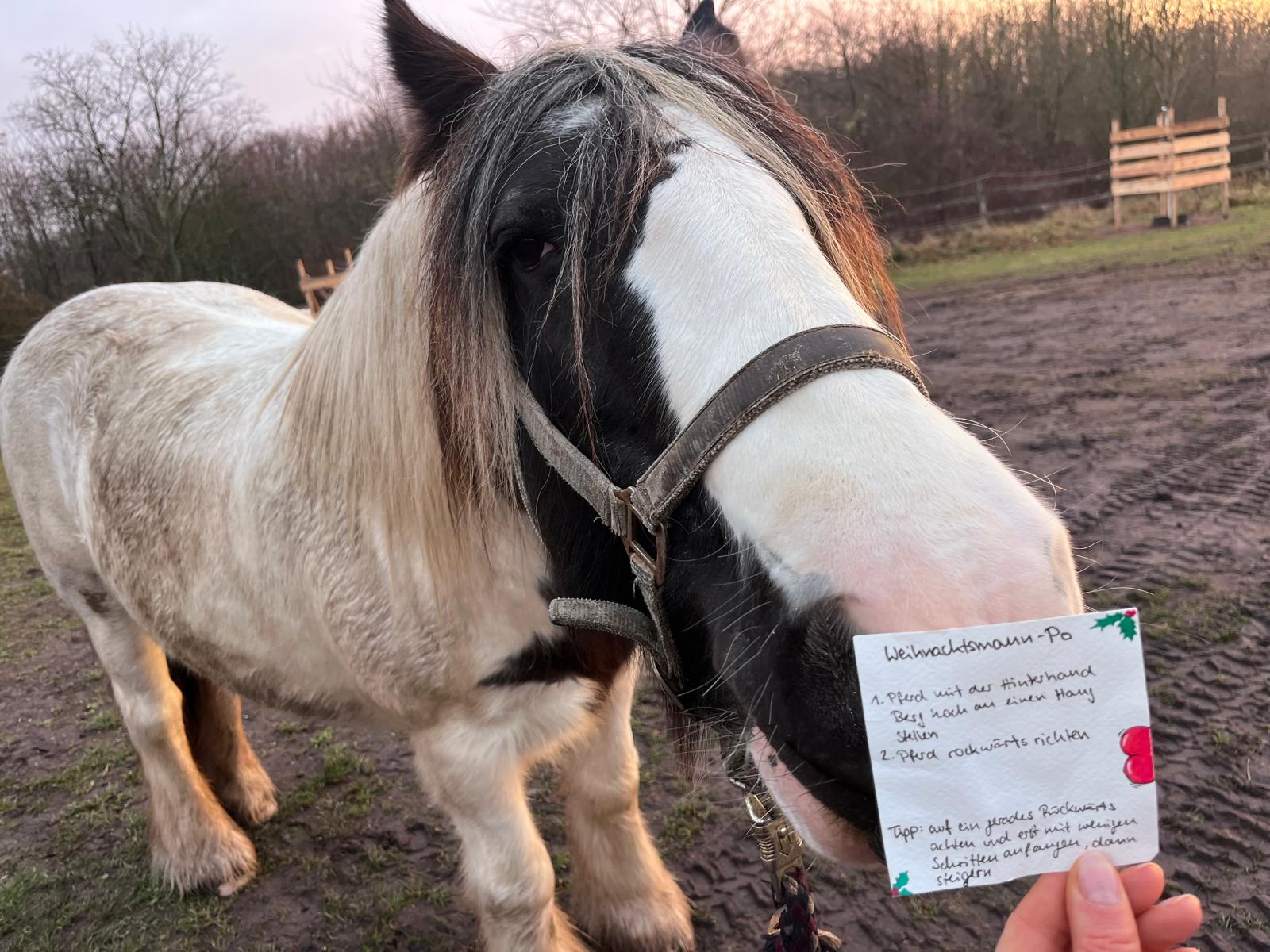 Auch in diesem Jahr gab es wieder einen Adventskalender für unsere Fellnasen. Weil aber Essen allein nicht gut ist, gab es für jedes Pferd eine Aufgabe. Ob es Stangenarbeit, Bodenarbeit, Geschicklichkeit oder ein kleines Kunststück ist, das zeigt sich erst am jeweiligen Tag. Bis jetzt hatten alle Pferde sowie die Reit- und Pflegebeteiligungen viel Spaß und Freude daran, sodass viele Übungen und Tricks weiter geübt werden.